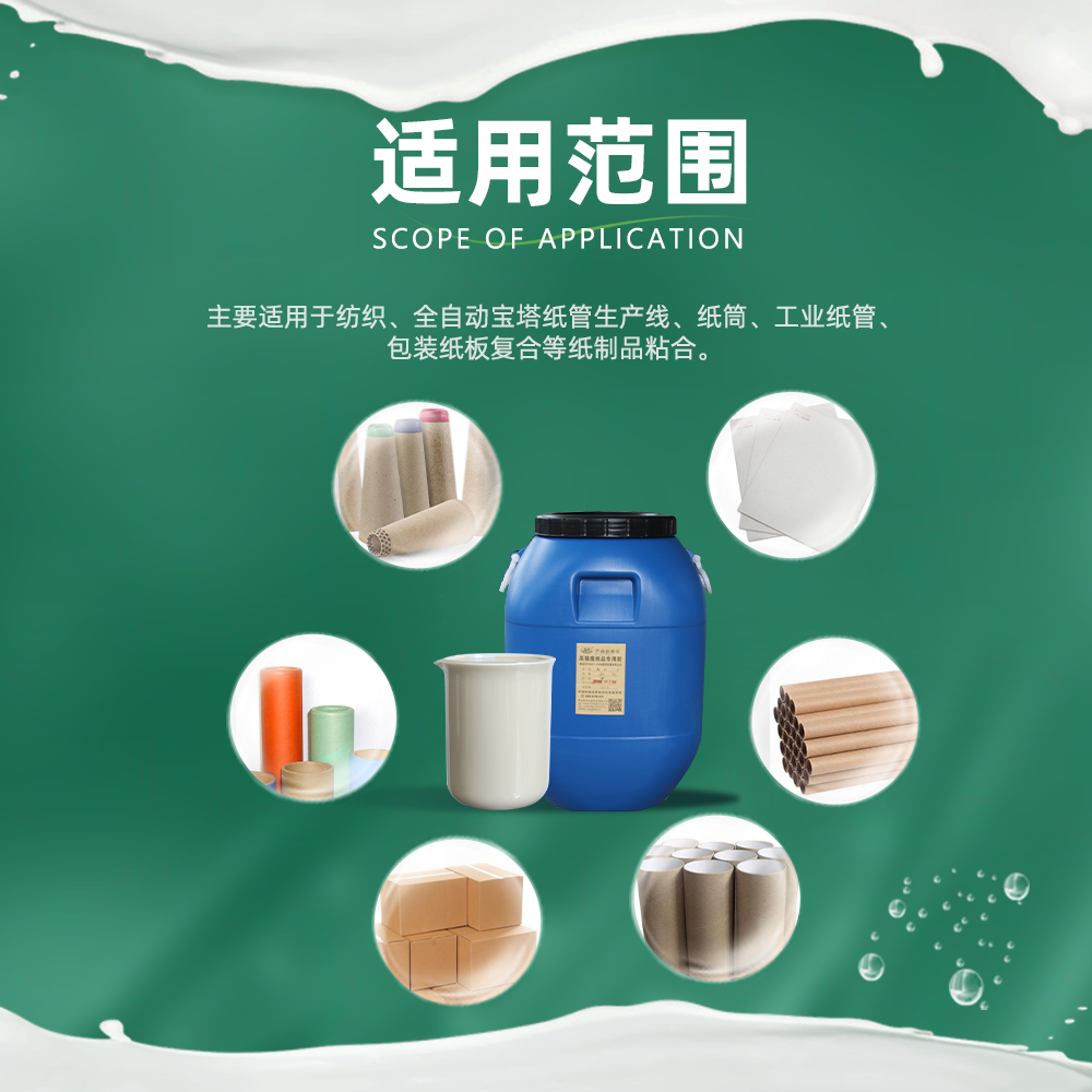 产品特点 : 乳白色粘稠乳液。初粘力好,干燥快,缩水率低,成品率高,最初破坏纸纤维时间小于6秒。固含量高、无沉淀,适用于转速每分钟生产纸管18-25米的卷管机施胶,一次成型降低劳动强度。粘接度高,用该胶所生产的纸管抗压强度、耐水性能比其它胶生产的纸管环压、耐水更优质。该胶长期使用对人身无害,使用方便。