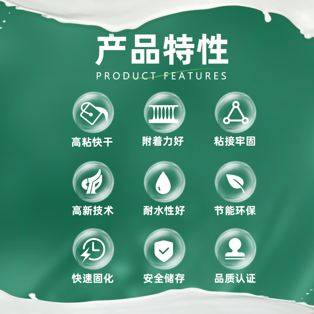 产品特点 : 乳白色粘稠乳液,有较好的流动性。 干燥速度快,粘合力强,硬度高,最初破坏纸纤维时间小于8秒,生产过程中根据纸张要求或客户对纸管、纸制品强度要求,可兑20%-30%冷水稀释,搅拌均匀即可施胶,卷管机卷速每分钟可生产纸管15-20米,粘合牢固。