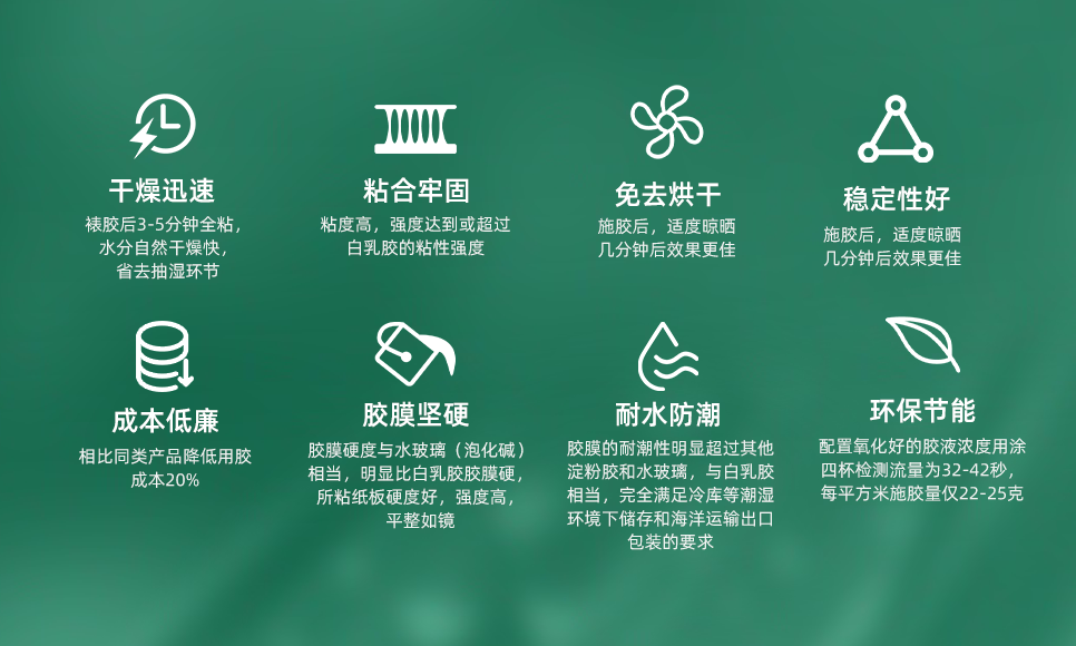 【特点】干燥速度快,粘合力强,硬度高,最初破坏纸纤维时间小于8秒,生产过程中根据纸张要求或客户对纸管、纸制品强度要求,可兑20%-30%冷水稀释,搅拌均匀即可施胶,卷管机卷速每分钟可生产纸管15-20米,粘合牢固。